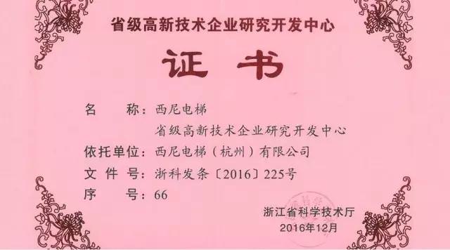 西尼電梯獲取“浙江省省級高新技術(shù)企業(yè)研究開發(fā)中心”榮譽證書