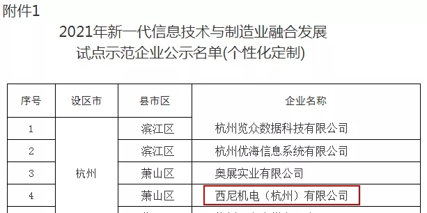 近日,浙江省經(jīng)濟和信息化廳官網(wǎng)發(fā)布公示了“2021年省級新一代信息技術與制造業(yè)融合發(fā)展試點示范企業(yè)名單”,西尼機電基于“電梯產(chǎn)品快速定制設計制造能力”入圍,是兩化融合管理體系貫標方向——個性化定制細分中,杭州地區(qū)僅入選的八家企業(yè)之一。